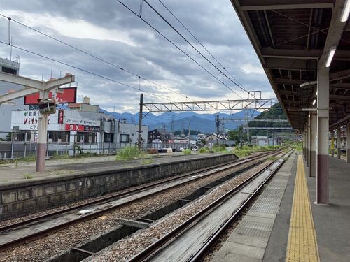 南小谷までやってきましたが、駅前に何かあるわけではないので、次の列車までボーっと待ちます。 まもなく乗車可能とのことで、改札を通りのりばに向かいます。 帰りもリゾートふるさと号に乗車して長野に向かいます。 北アルプスは天候が悪そうです。 7月で…