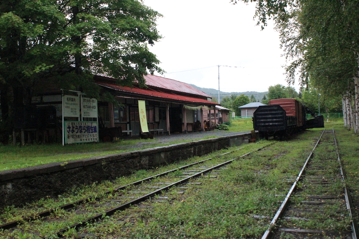 こちらが駅舎とホームです。ホームは1面当時からしかなかったようです。相生線は北見相生が終着駅となっていました。ホームには貨車が停められています。線路には雑草が生え放題となっていて、いかにも廃線感を漂わせてくれます。