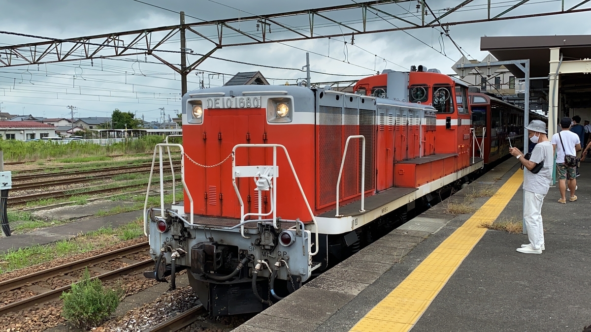 実はSLが故障とのことで、ディーゼル機関車が代わりに牽引するらしい。SL牽引を楽しみにしていたのに残念ですが、これはこれで貴重なのかもね!